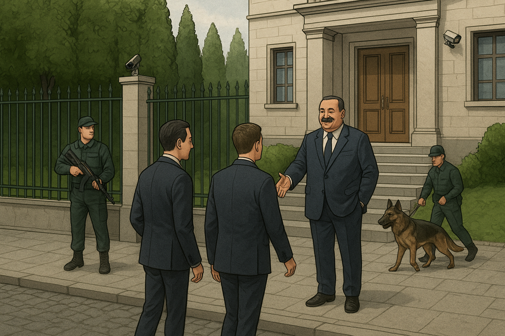 Visoka ograda i četinari posađeni uz nju čine dvorište skrivenim od pogleda. Na glavnoj kapiji je naoružano obezbeđenje koje ih ljubazno propušta dajući im tako do znanja da je njihova posjeta očekivana. Dvorištem kruže dva čuvara sa vučjacima koji njuše svaki pedalj ispred sebe. Očigledno je pokrenut neki vid interne istrage. Prilaz zgradi pokriven je video nadzorom i ambasada ovako izbliza djeluje kao najsigurnije mjesto na planeti.